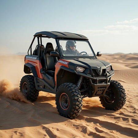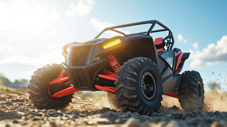 A black and red UTV (utility terrain vehicle) with orange accents is racing on the dirt, dust flying behind it. The sun shines brightly in front of it. Shot from the side. --chaos 30 --ar 16:9 --v 6.1 Job ID: 25e8296c-6432-47a2-a2f0-8a09aaba589d