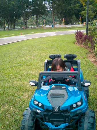 An Asian kid driving electric toy car in a tropical park. Outdoor toys. Children in battery power vehicle. Little girl riding toy truck in the garden. Family playing in the backyard.