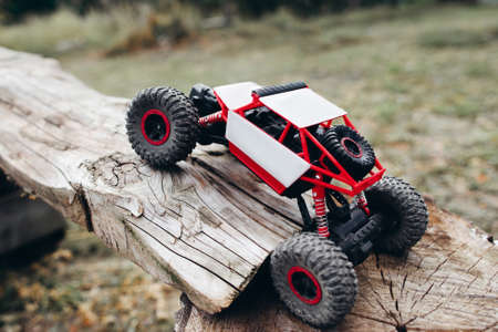 Rc car overcoming wooden log, free space. Small crawler rising beam. Toy suv roading off road landscape.