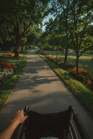Person pushing wheelchair along a flower-lined path under tree canopy in a serene park setting. Ideal for accessibility, nature, and lifestyle themes.