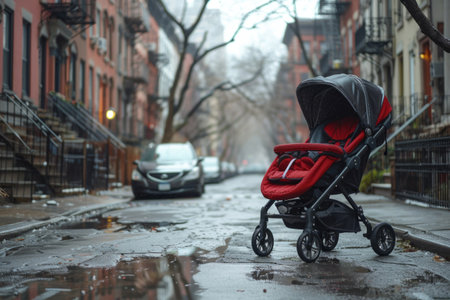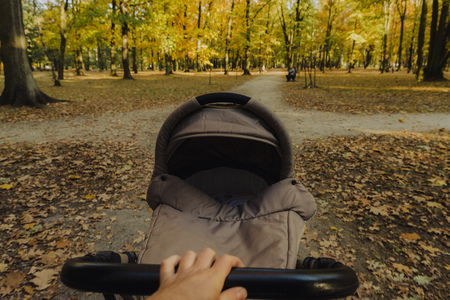 Row of colorful empty baby strollers is standing on a paved path in an autumn park