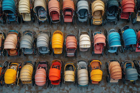 A variety of baby strollers in multiple colors are neatly arranged in a row, creating a striking visual display. The scene is set outdoors, with natural light showcasing the bright hues of the strollers.