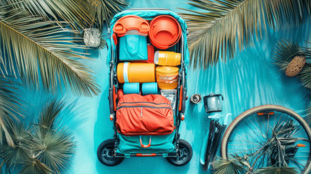 A vibrant display of travel gear arranged on a tropical backdrop, showcasing colorful bags, containers, and equipment for outdoor adventures.