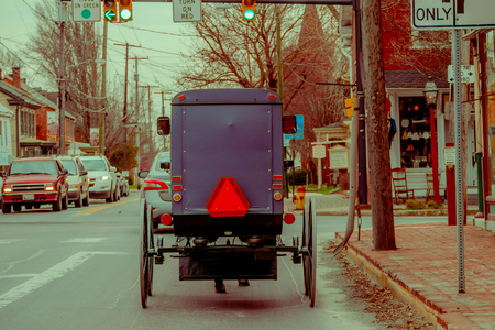 LANCASTER, USA - APRIL, 18, 2018: Outdoor view of the back of old fashioned Amish buggy with a horse riding on urban road surrounding with cars and traffic lights
