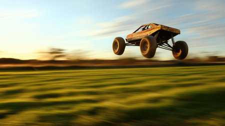 A thrilling image of a monster truck leaping through the air above a vibrant green field, captured during sunset, showcasing the excitement of off-road adventure.