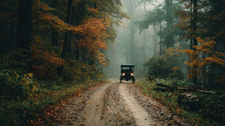 A vintage car cruising along a serene dirt road surrounded by a misty autumn forest. The scene captures the tranquility and beauty of nature in fall.