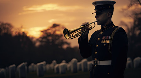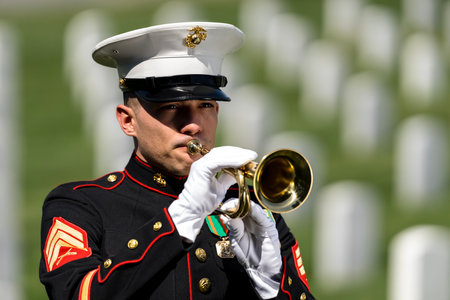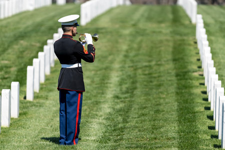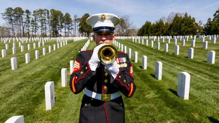 A poignant moment unfolds as a Marine plays taps, honoring a fallen veteran with a solemn salute, marking their internment at a national military cemetery.