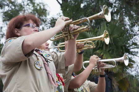 Trumpets play Taps at 2014 Memorial Day Event, Los Angeles National Cemetery, California, USA