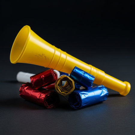 A cinematic environmental wide shot of organized fan gear (clappers and air horns) resting on a conc
