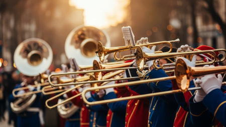 Thanksgiving and Harvest Festival. A marching band performing a lively Thanksgiving tune, their instruments and uniforms adding to the joyful spirit of the holiday.