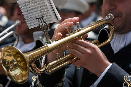 Close up and details of playing musicians, instruments in a marching, show band or music band