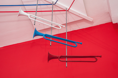 Three bright contrasting old trumpets of red, white and blue colors are suspended from the ceiling against the wall.