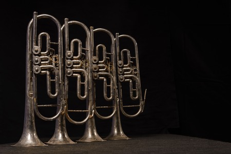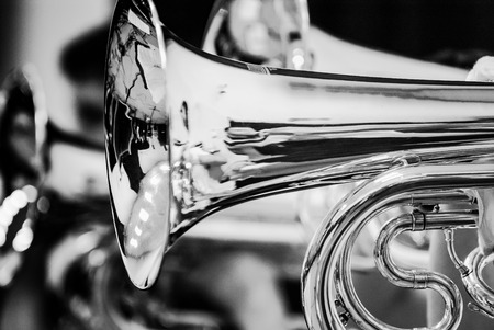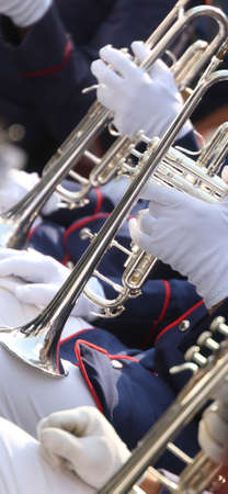 Details from a music, show and marching band. Playing musicians wind instruments in uniforms. Baritone, Mellofoon.