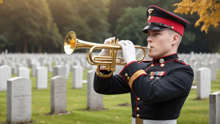 Soldier in military uniform playing the trumpet on the war cemetery.