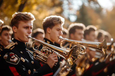 Young musicians in uniform are playing trumpets during an outdoor parade in autumn