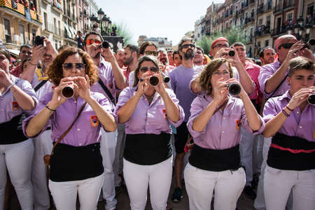 Tarragona, Spain - September 15, 2019: Detail of a group of grallas during a human tower performance in Santa Tecla's Festival in Tarragona (Catalonia).