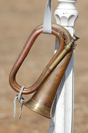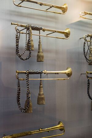 A group of golden medieval trumpets in a circular arc proclaiming a special heavenly occasion on light blue cloudy sky background