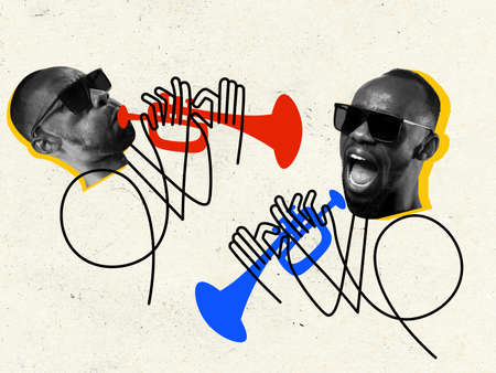 Creative retro design. Contemporary art collage of young stylish men playing trumpet isolated over light background