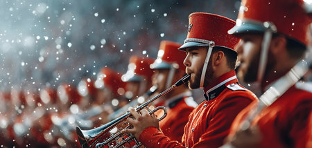 A marching band, dressed in vibrant red uniforms, performs passionately. Snowflakes add a magical touch to the energetic atmosphere, enhancing the show's excitement.