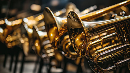 A row of brass instruments, including trumpets and trombones, lined up backstage before a big concert, waiting to be played.