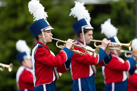Louisville, Kentucky, USA - May 2, 2019: The Pegasus Parade, Members of the Jennings County High School Marching Pride, performing at the parade