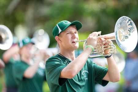 Arlington, Texas, USA - July 4, 2019: Arlington 4th of July Parade, Members of Arlington High School, marching band, performing at the parade