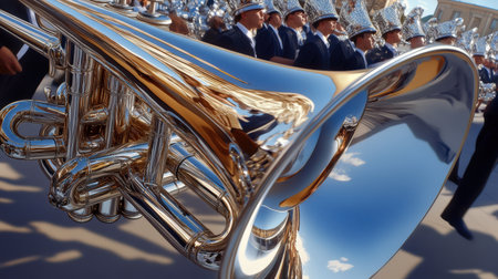 A stunning macro view captures a trumpet reflecting a bustling parade with bright colors and dynamic energy. The warm light enhances the festive atmosphere, celebrating community spirit.