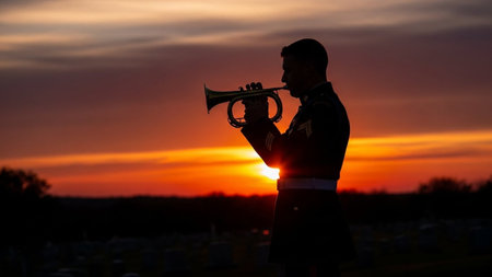 Silhouette of a man in military uniform playing the trumpet at sunset