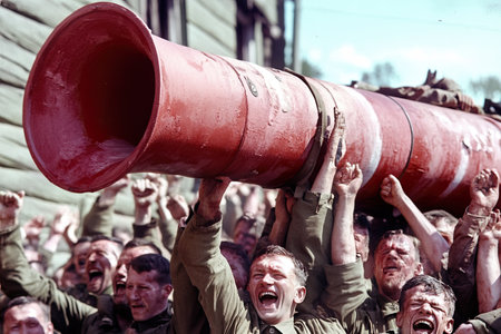 Celebrating their hard-fought victory, soldiers proudly demolish propaganda materials during a rally in 1945.