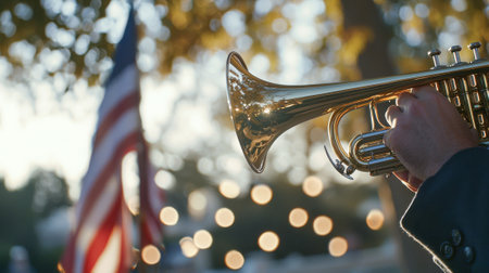 Close-Up of Musician Playing Trumpet in Sunlit Park with American Flag in Background. Concept of Patriotic Music, , American Memorial Day, Outdoor Concert, National Pride, Independence Day.