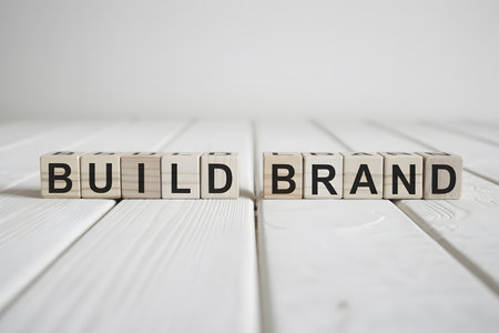 Close-up of 'BUILD BRAND' in white wooden letter blocks on a textured white plank. Minimalist design with soft lighting and blurred background, ideal for branding imagery.