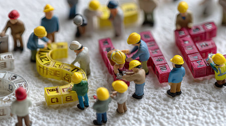 A vibrant scene featuring miniature construction workers assembling letters on a white surface. The colorful details highlight teamwork, creativity, and craftsmanship.