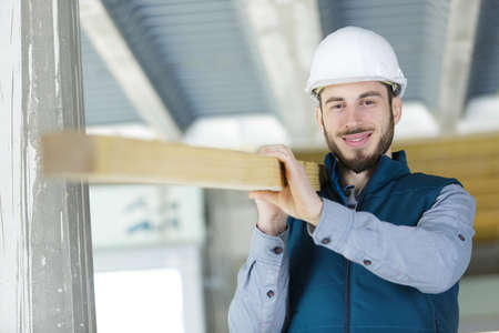Carpentry work in construction. Carpenter with boards on his shoulder in a building under construction. A construction worker in a white hard hat and orange vest.
