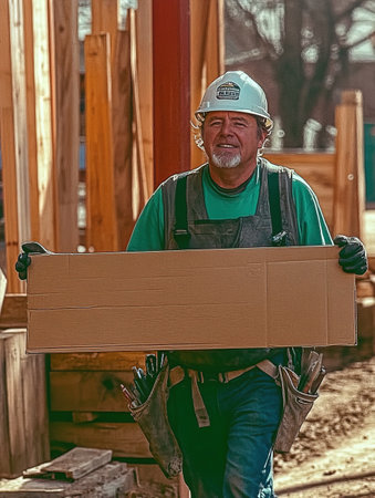 photo of a man in construction gear holding an empty cardboard sign, standing near a construction site, daytime, vibrant colors --chaos 12 --ar 3:4 --weird 150 --v 6.1 Job ID: 5b708b89-feb9-4a73-a9aa-11b5f894f873