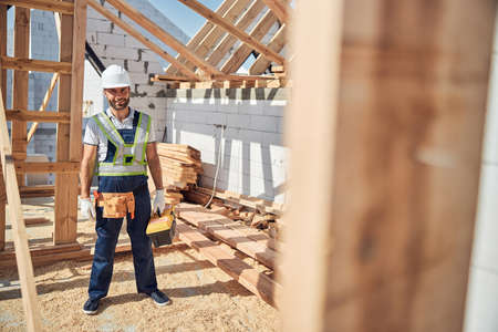Positive delighted young builder being on construction site