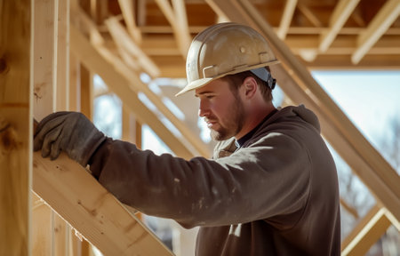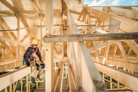 Construction worker wearing safety equipment and building wooden roof structure on construction site
