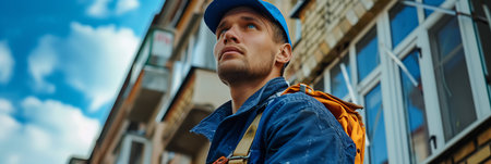 Portrait of a young male construction worker working at the window.