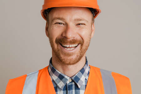 White man worker wearing helmet and vest laughing and looking at camera isolated over grey background