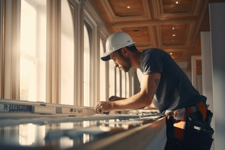 A dedicated construction worker, equipped with tools and a hard hat, carefully measures wooden beams at a busy construction site. The atmosphere reflects productivity and focus.
