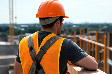 Construction worker wearing high visibility vest and hardhat inspecting building site from above
