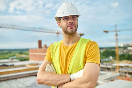 Caucasian young adult man wearing construction helmet and safety vest standing with arms crossed on building site overlooking urban landscape, holding walkie talkie
