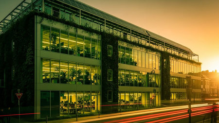 An exterior view of a modern, eco-friendly office building at sunset. The facade is characterized by extensive glass windows and vertical greenery climbing the walls. Solar panels are visible on the rooftop, highlighting the building's sustainable The warm light of the setting sun illuminates the scene, and light trails from passing traffic create a dynamic effect on the street below. The building appears integrated into an urban environment, showcasing a commitment to green architecture.