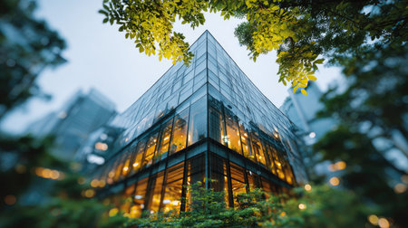A striking modern glass building stands majestically amidst lush greenery, showcasing an exquisite blend of urban architecture and natural elements at dusk.