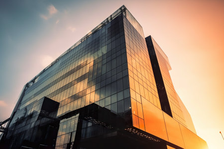 Glass facade of modern skyscraper reflecting vibrant sunset clouds, creating a stunning visual