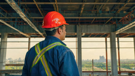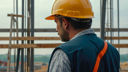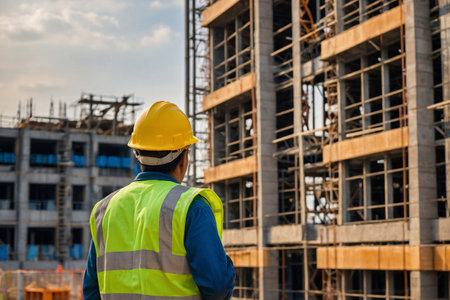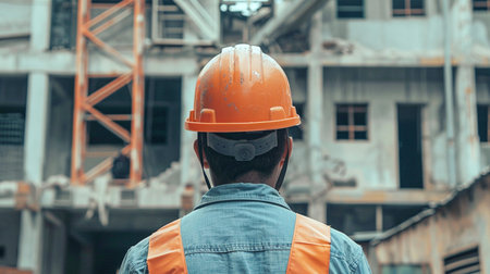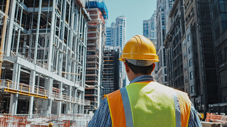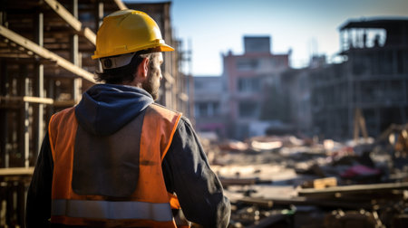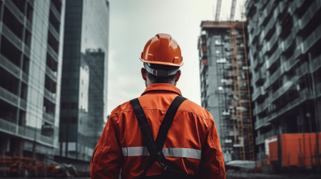 Back view of builder man looking at construction site. Back view at construction worker wearing hardhat while standing at high rise building. AI generated