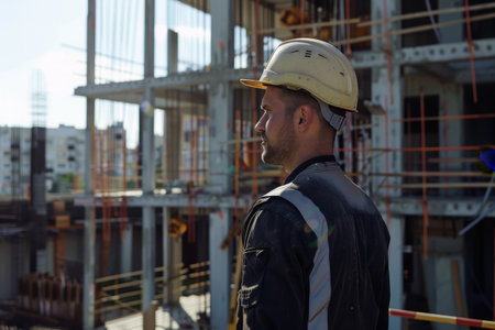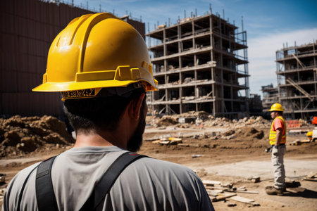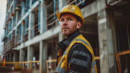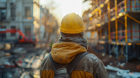 Construction worker in yellow safety vest and hard hat stands at construction site, observing the work with sunlight illuminating the environment, emphasizing safety and professionalism, AI generated