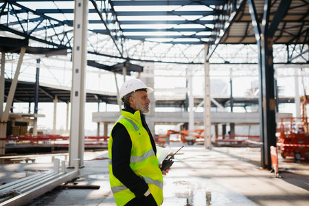 Construction foreman giving instructions over radio during building inspection.