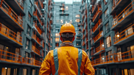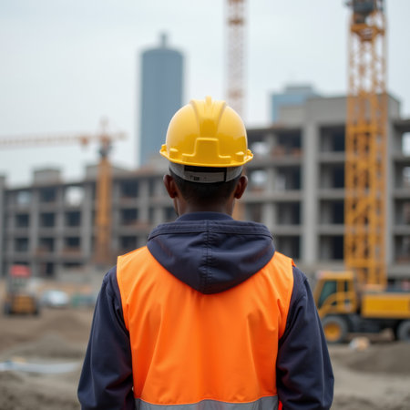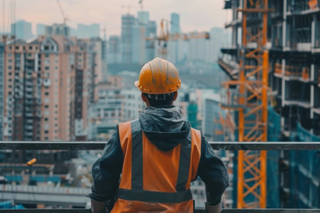 A vigilant construction professional in a bright safety gear surveys ongoing development amid towering cranes and modern cityscape silhouettes, capturing urban growth ene