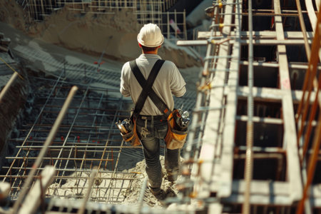 The male worker ascends a construction site wearing a helmet and uniform. AI