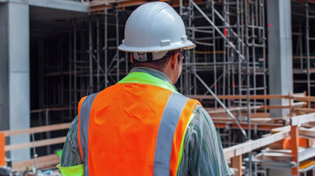A man in a bright orange safety vest and yellow hard hat is working on a construction site. Concept Construction worker, PPE, Safety equipment, Job site, Hard hat